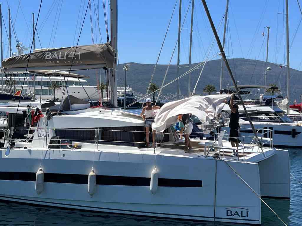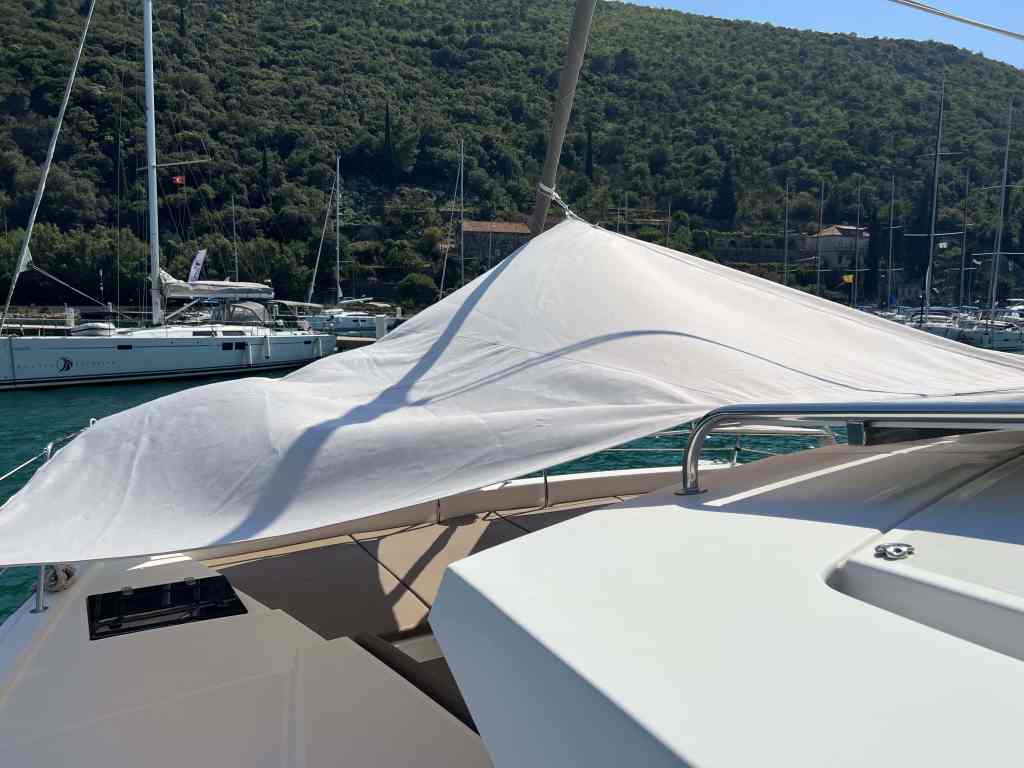 Once we experienced the heat in Montenegro, we also asked them to help us create sun shades for the upstairs windows (which nicely double as mosquito nets), screens for the stern deck, and a large shade for the foredeck (we call it “the tent”). The tent took some creative experimenting, but they came up with a fabulous solution. All of these additions do make a difference.
