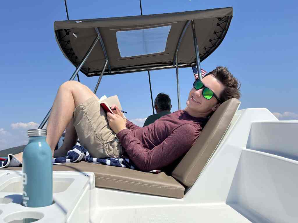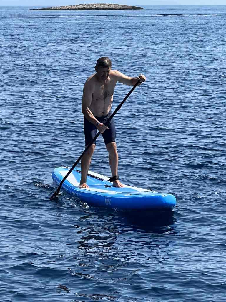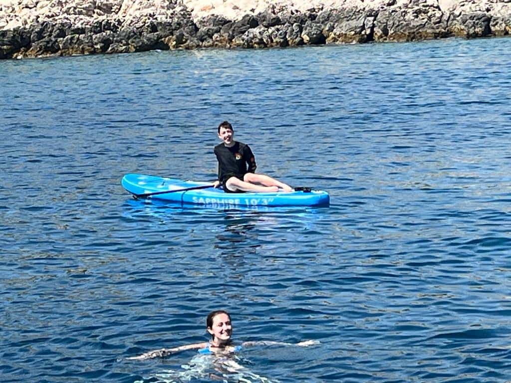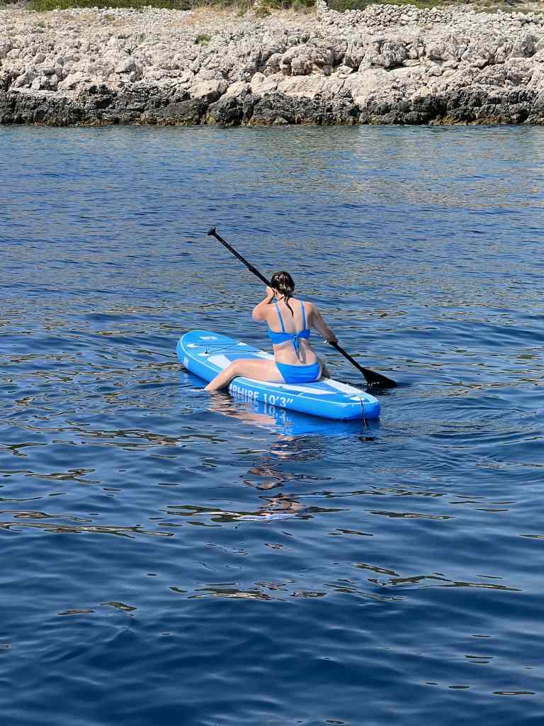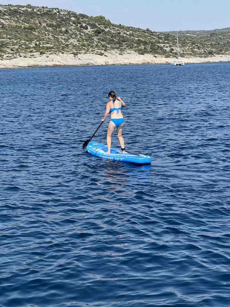 On our way back to the mainland, we had a really fun lunchtime at anchor where we tested out our new SUP for the first time. Some were more successful than others. 😉