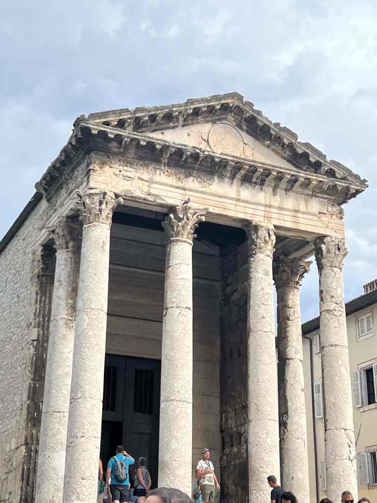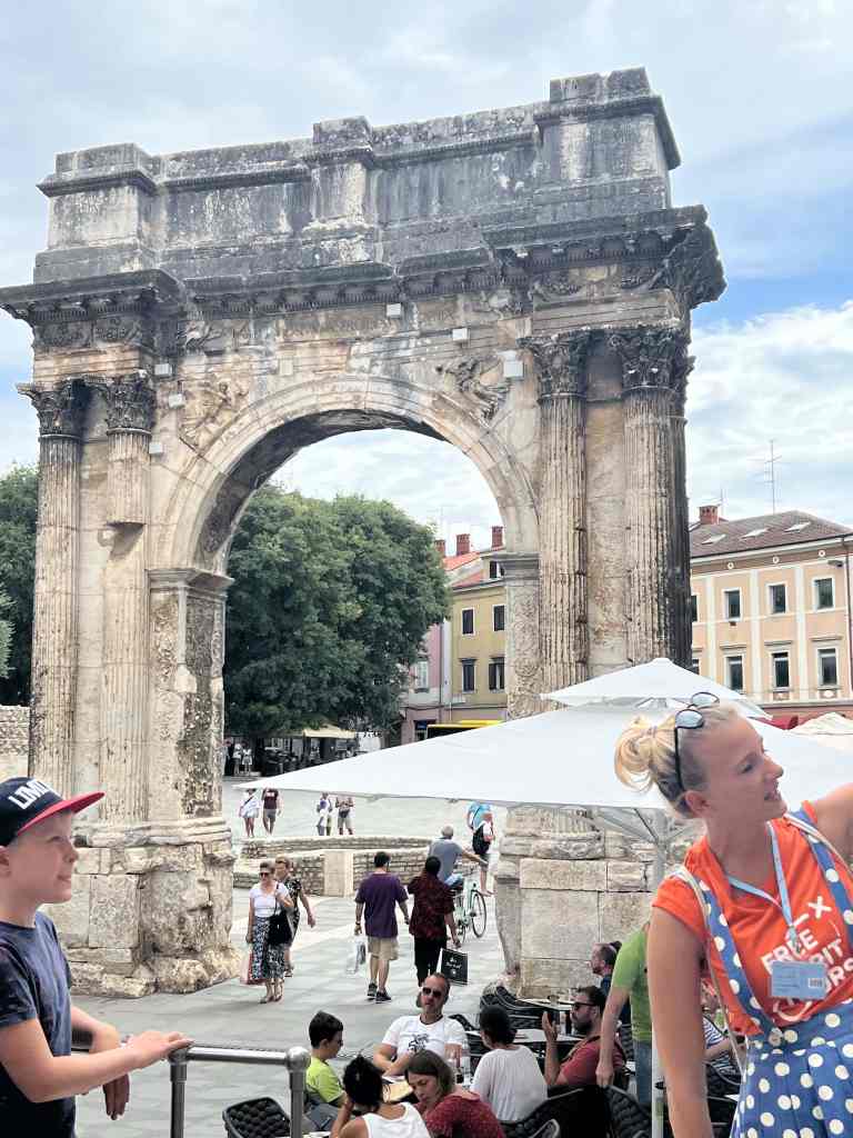 I think we had our best walking tour here in Pula as our guide, Martina, was great. She is an elementary school teacher and was full of energy. We saw all the sites, learned great history, and received great suggestions too. I already mentioned in a previous post how we love the way historic buildings and structures are just a part of everyday life here. We saw this throughout the city. Here’s a smattering of neat sites…
