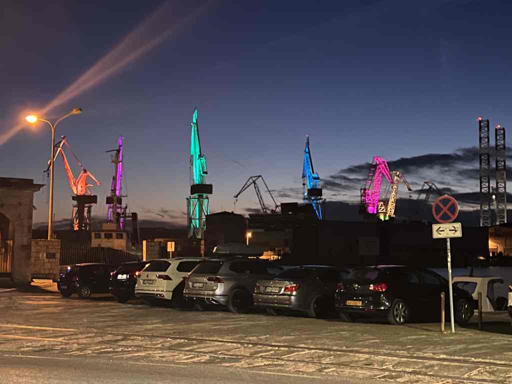 I will say that our entrance into Pula was not encouraging as it is an extremely industrial area. Huge shipyard area. However, the cranes redeemed themselves by night by being artistically lit up. I thought they even looked kind of like origami cranes.