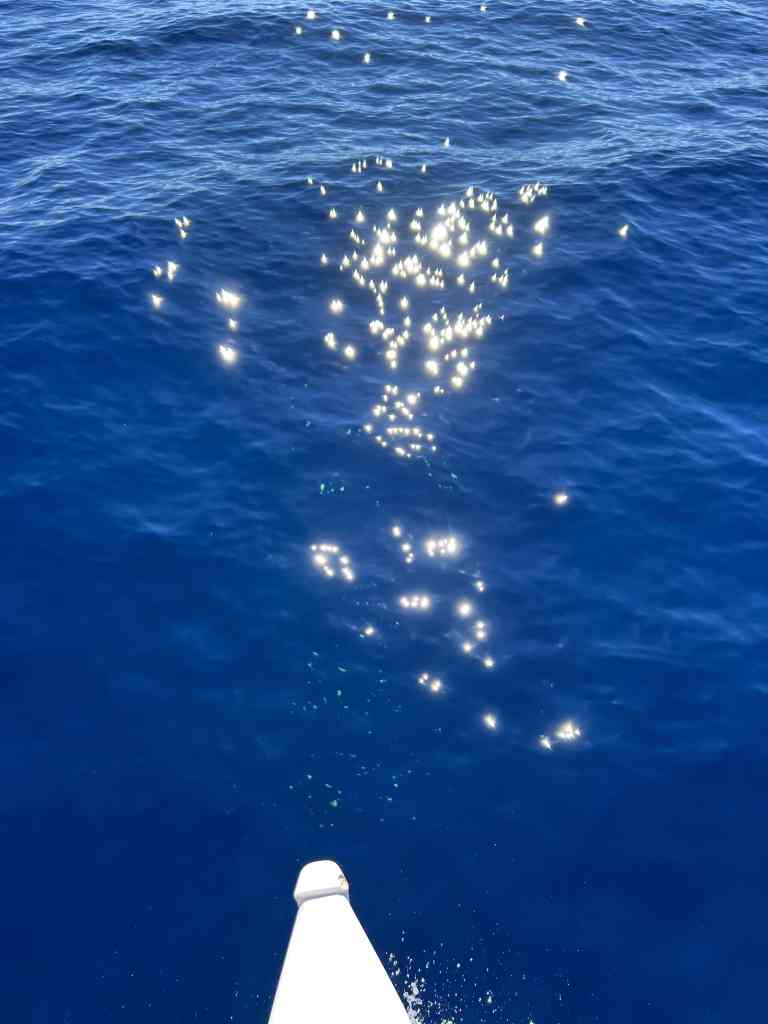 So that’s what I need to work on. Time to get back out on the bow and focus on the water right below… Recognizing and embalming on my brain the deep blue color, the sparkling sun reflections, the calm rolls, the small amounts of froth, the white caps that today are far and few between, the “sun star” shape that is made in the water right below my feet, the sound of the water crashing against the hulls as we cut through, the sound of the engines propelling us forward, the company of dear friends sharing the moment.