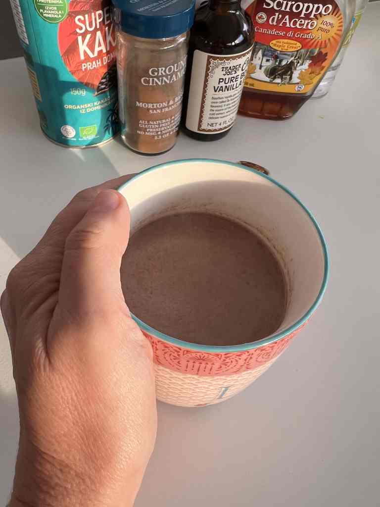 By 4pm I’m usually ready. In Ireland or the UK it would be called “afternoon tea,” but I call it hot chocolate time. Conor, of course, makes plenty cups of tea, but I have always had a hankering for warm, creamy chocolate. 🙂 I used to make this for our kids back home in the wintertime, and with luck have found some of the key ingredients here (or I brought them with me from our last US trip). As the sun starts to set and the day shifts colder, there’s nothing like a warm cuppa. Now if you happen to be at a bar here ordering una cioccolata calda, you literally will receive a warm cup of thick melted chocolate – decadent! Just for grins, I thought I’d share my concoction in case any of you might like to try it out on a cold winter day!