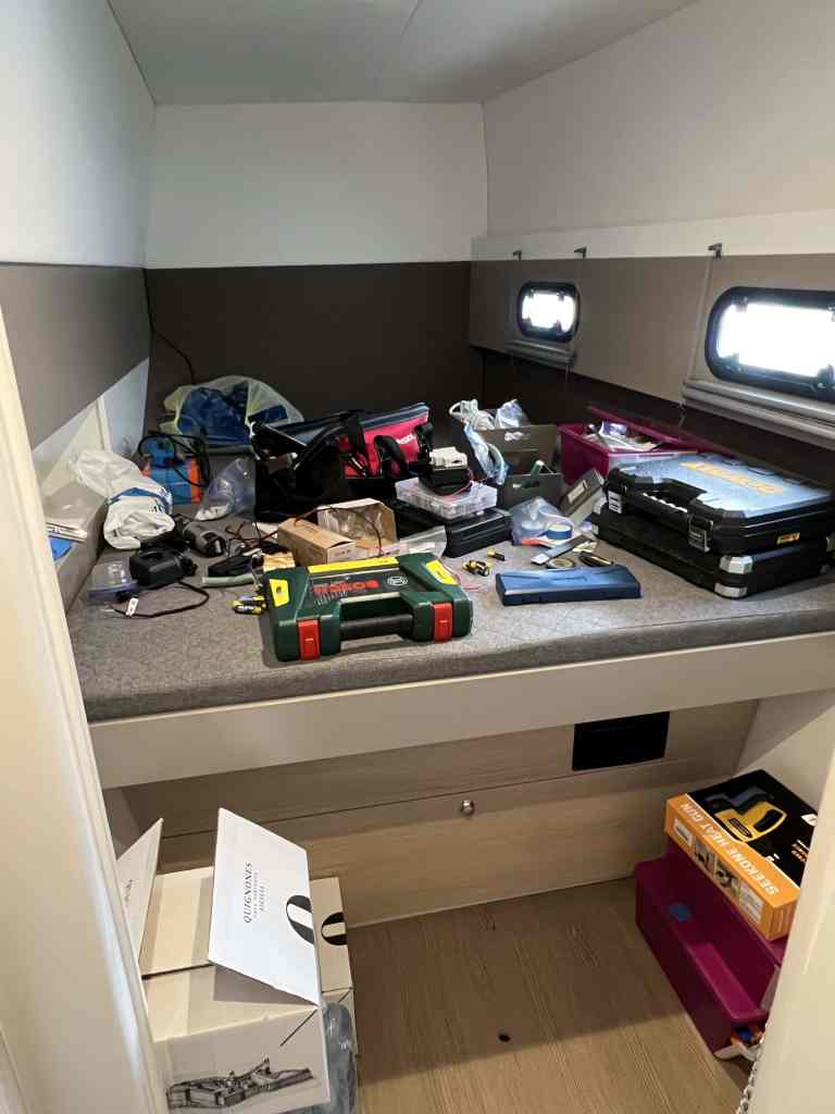 Conor has been very busy doing so much research and procurement for all the upcoming boat projects. (I promise to report on them as they become reality.) He also spent a couple of days clearing out all of our storage lockers to take inventory, get organized, and start tinkering. Given the boat was taken over, I needed to get out and find some space to do classwork. Let’s say it was 1:30pm right after we had finished having lunch. The marina office has a nice little work space available for use, but when I inquired, I learned that it is only available when the office is open – so not during their long riposa hours in the afternoon. Next, we do have a nice bar (cafe) also in the marina, and they just so happened to be closed on that particular day. So, I went scouring the town to find another open bar that would have space indoors in which to work. (It was pretty cold outside.) I walked all over and was surprised to find so many of them closed and/or only have outdoor tables set out on the sidewalk. We’re talking tiny places with a few plastic chairs set up outside where you just pop in to order your coffee. I ultimately went back to the only other nice indoor bar we had discovered and been to once for lunch, Caffuccino. I had prepared on Google Translate to ask if it was ok if I worked there. It took me a while to figure out that this got lost in translation – the owner thought I was asking if I could get a job there! Eventually, with enough miming, we settled that it was fine for me to stay as long as I was ordering something, of course. I was able to get some solid hours of work done, which was great. It struck me, though, that aside from Conor and myself, I have never seen anyone working on a laptop here. Coming from Silicon Valley, that is quite the common site, but here not even a hint. It’s definitely not the Italian way. It was a funky feeling, and wow, I had never missed an American coffee shop so much! Conor has since set up one of our forward cabins as his “man cave” where he can tinker away to his heart’s desire. 🙂
