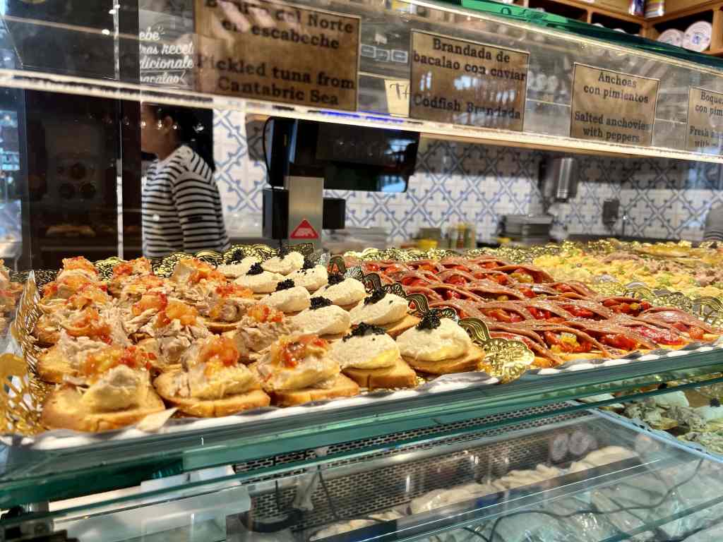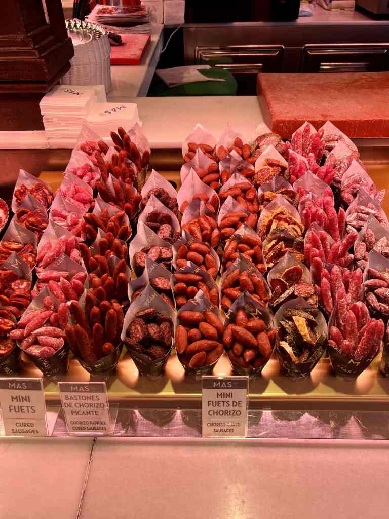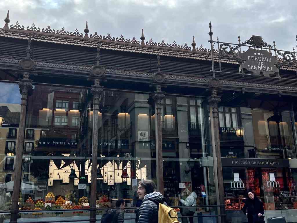 Did I mention the food? It was difficult to find a bad meal in Madrid. We ate lots of tapas (small plates), typically for lunch, and enjoyed a variety of meals, even an amazing Spanish Thai dinner. We, of course, had to get some paella, (potato) tortillas, and some churros with chocolate. In Spain (and Italy, and the UK if I recall) if you order “hot chocolate” you literally get a cup of melted thick, creamy chocolate. Perfect for dipping churros into. Orange juice is always freshly squeezed (as is the same in Italy), sangria is awesome, and Conor ventured to say the Spanish red wines were even better than the Italian (shh!). The Spaniards love their pork – Iberian ham – and I couldn’t get over the cured legs of pigs we would see in many places. Madrid also has many fabulous food markets. The most famous is the Mercado de San Miguel, similar to the Boqueria in Barcelona. You can eat there, purchase goods to take home, or just walk around and admire the food art, which is what I love to do.