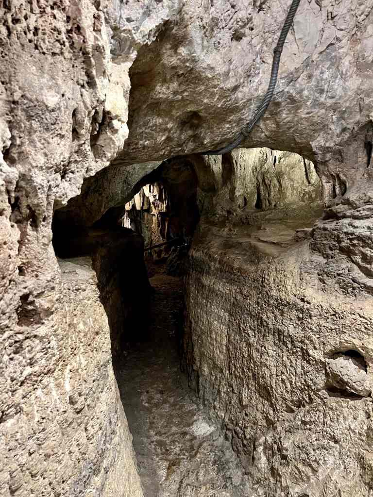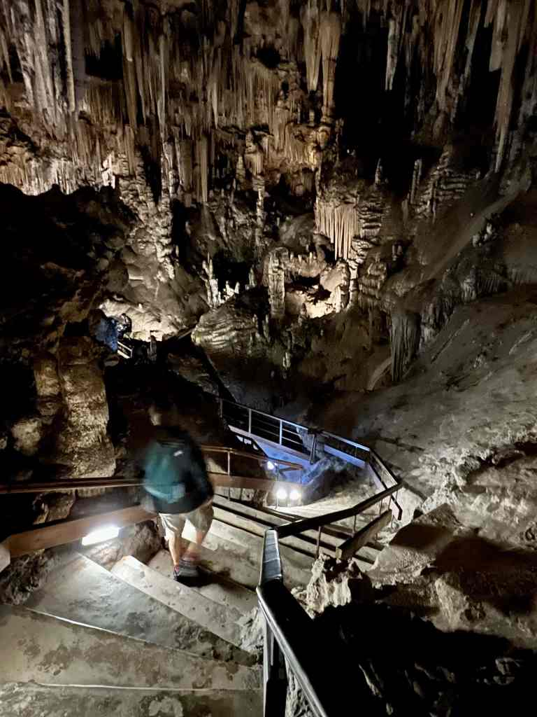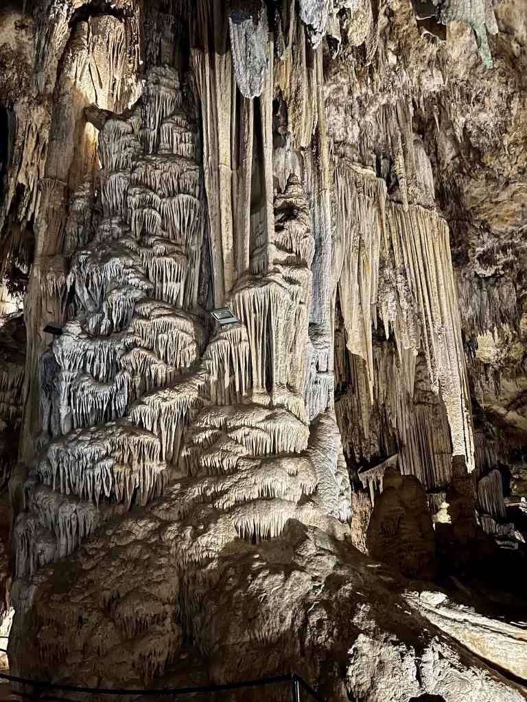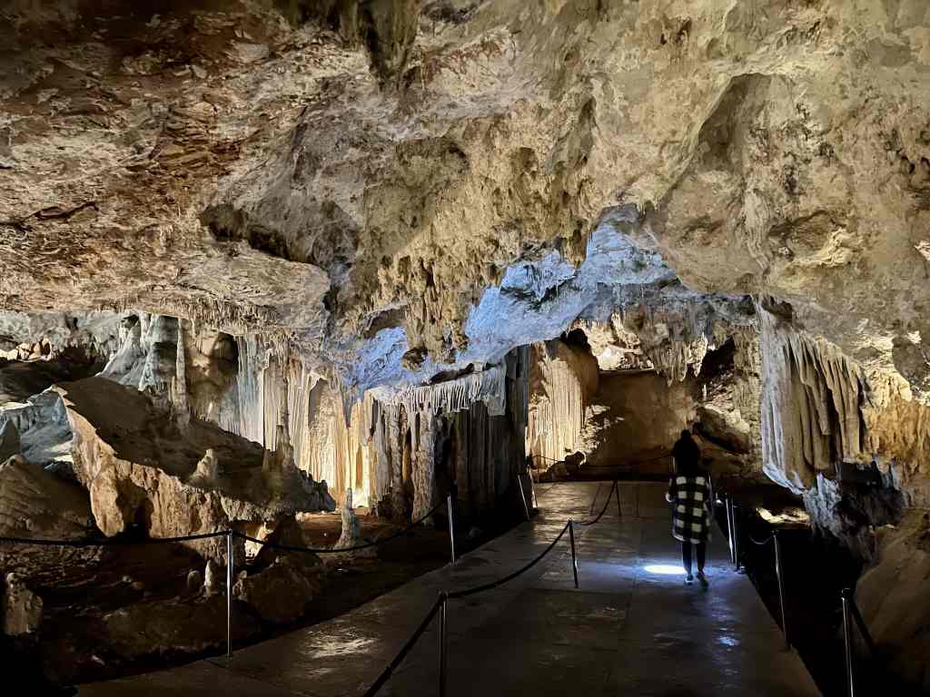Now Nerja is not really known for sightseeing, but it does have one really interesting place worth visiting – the stunning Cueva de Nerja (Caves of Nerja). Discovered in 1959, this set of caverns stretches for about 3 miles / 5 km, but only only about a third of it is safely open to visitors. Even so, the enormity of what you can see is mind boggling. Archeologists have determined that humans frequently lived here for over 41,000 years. There are hundreds of cave paintings (which unfortunately you can’t really get to) and really impressive geological formations (stalactites, stalagmites, columns, gours and spirals). Sadly, you can’t really grasp the scale of it all through my photos.
