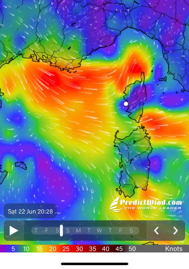 Sounds like the perfect place to sail, right? Well, the flip side is what is called the Mistral. In the Mediterranean, there are actually several predictable winds that blow regularly. They each have their own name – like the Bora which we experienced a lot in Croatia and Montenegro, and this year the Sirocco which comes from Africa and typically dumps red sand on everything. (You can learn about seven winds here.) The Mistral is a new one for us, and we’re learning that it makes sailing around Corsica extremely challenging. It is a dry, cold, and very strong wind that comes from northern France and expels itself into the Med via the Gulf of Lion. Strong winds also create big swell.
