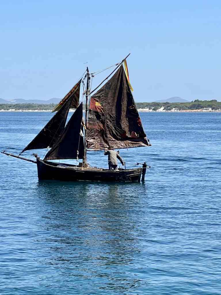 The largest city, Cagliari, sits on the southern tip of the island and is the capital of Sardinia. As with any urban city, you can find something for everyone – culture, art, history, outdoor recreation, nightlife, modern amenities, etc. We anchored outside its popular beach suburb of Poetta for a few nights awaiting our next guests and were entertained by the plethora of sea activities passing back and forth. We also made use of the bus system as well as our feet to explore various areas of the city. Our wanderings took us to the lovely historic center of Castello as well as some off-the-beaten-path more modern neighborhoods.