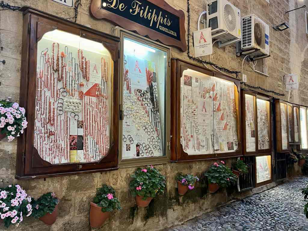 Other unique things we noticed in Alghero are the prominence of coral and the colorful vintage boats. Turns out, Alghero developed much wealth from its ancient farming of red coral (or “red gold” as it’s often called) that is plentiful along its coastline. You will find endless jewelry shops featuring this treasure and an interesting Coral Museum that tells the story of its long history and importance to the town. We also saw many vintage coral fishing boats (corallinas) having a regatta.